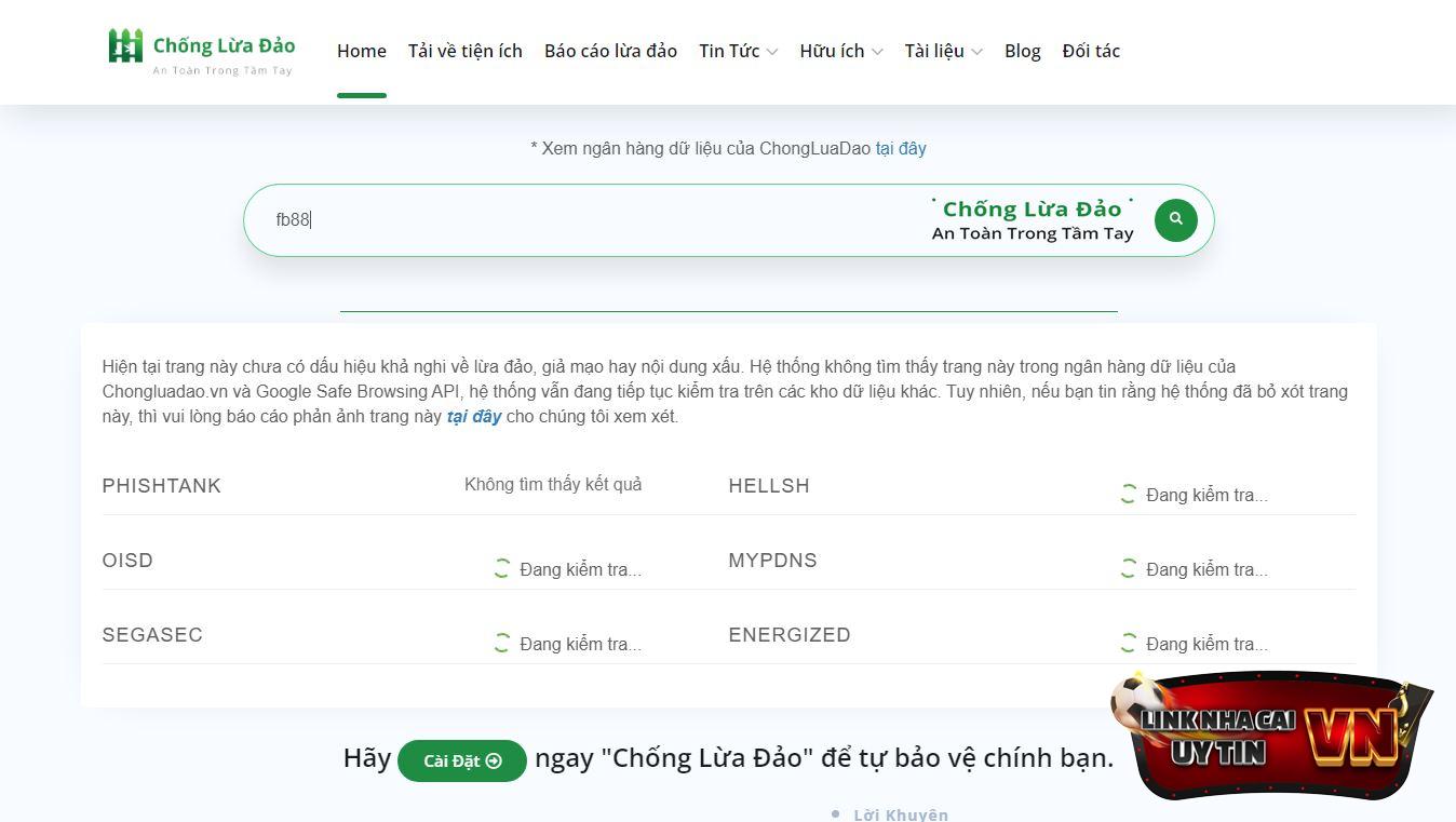 Cũng là một trang check uy tín Online, chongluadao.vn được thành lập để kiểm tra uy tín các trang web, nhà cái, cổng game. Sử dụng thông tin “Fb88” để kiểm tra, check uy tín trang web Fb88.