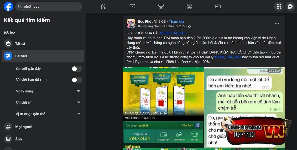 Hiện nay trên các hội nhóm ở các trang mạng xã hội như: Facebook, Telegram, Instagram, Twitter,… Anh em có thể dễ dàng tìm thấy phốt cảnh báo về các nhà cái không uy tín. Đối với Facbook, anh em có thể nhập từ khóa “Phốt Fb88” để tìm kiếm thông tin check uy tín.