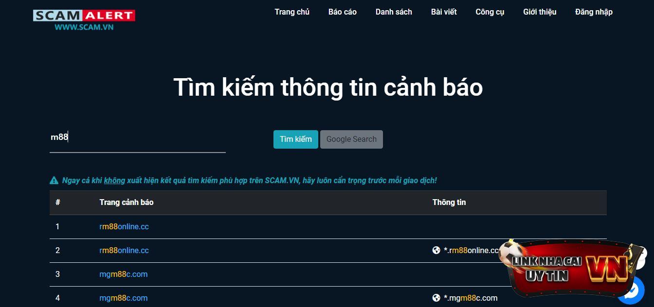 Trang Scam.vn cũng là một trang báo cáo kết quả lừa đảo, bịp của những trang web Online. Tiếp tục check thông tin bằng từ khóa “Nhà cái M88”. Anh em có thể thấy kết quả nhận về là hoàn toàn uy tín và không có phốt lừa đảo trước đây.