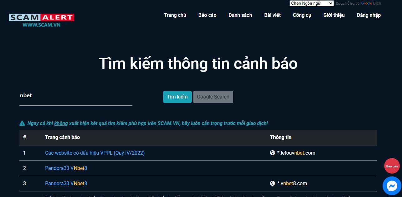 Scam.vn cũng là một trang check thông tin nhà cái lừa đảo như Nbet. Tuy nhiên kho dữ liệu của Scam.vn sẽ rộng hơn và được nhiều người dùng Việt Nam sử dụng hơn chongluadao.vn. Tiếp tục truy cập Scam.vn và sử dụng từ khóa Nbet để check thông tin.