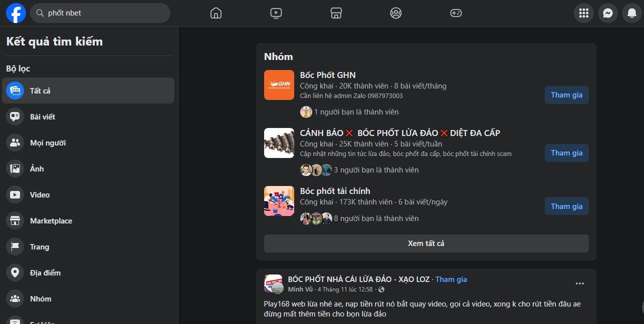 Trên các trang mạng xã hội như Facebook hiện nay đều có các group chia sẻ kinh nghiệm hoặc bóc phốt nhà cái không uy tín, lừa đảo. Anh em có thể tìm kiếm thông tin phốt Nhà cái bằng cách nhập nội dung “Phốt Nbet” ở thanh tìm kiếm Facebook.