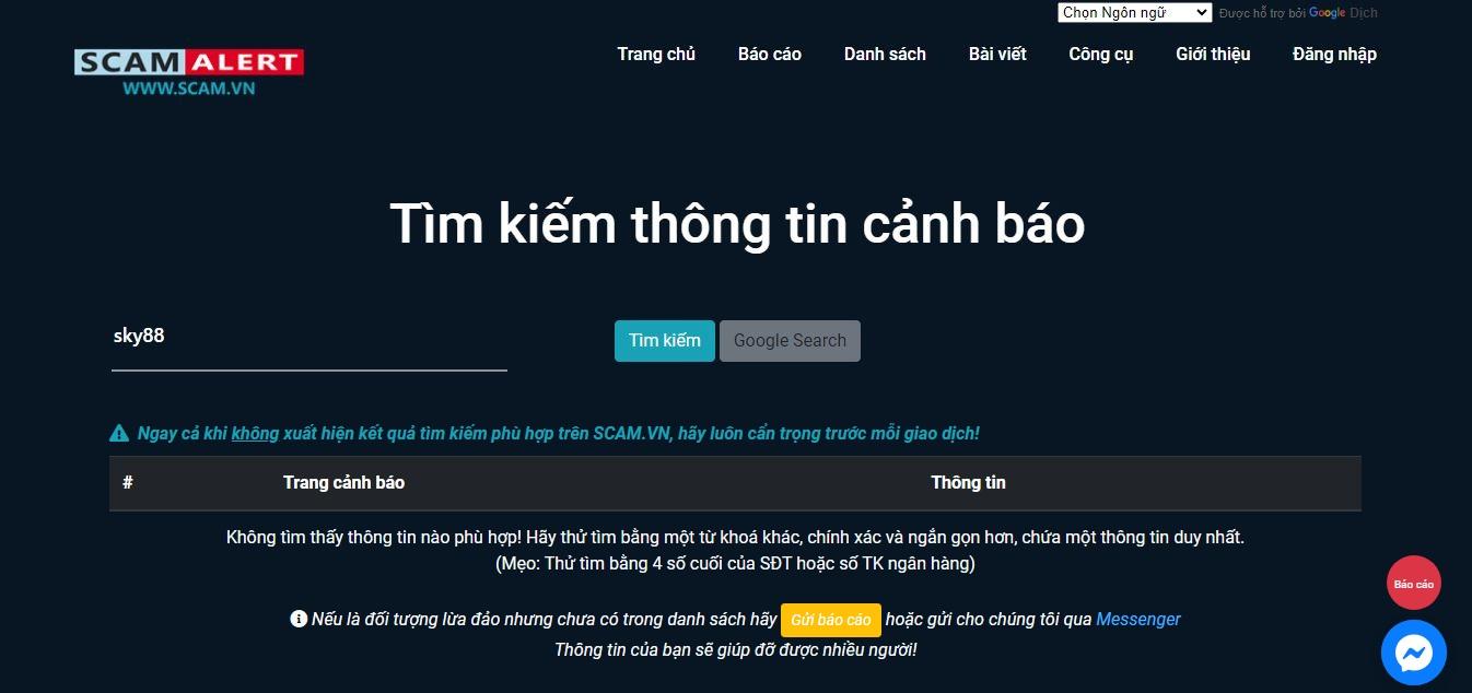 Scam.vn cũng là trang web check uy tín chính thống trực thuộc hệ thống Internet Việt Nam. Truy cập trang Scam.vn, sử dụng từ khóa “Sky88” để check thông tin.
