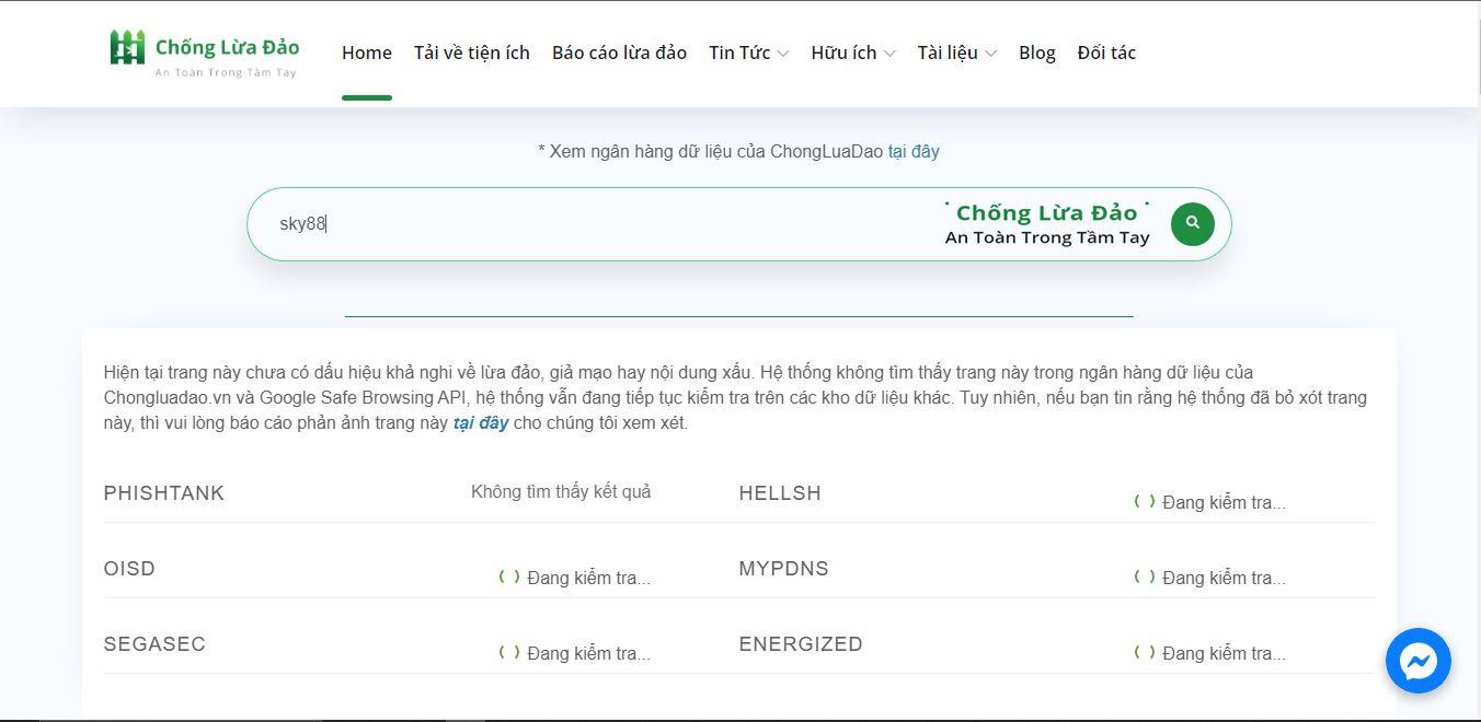 Trang web chongluadao.vn là trang được nhiều anh em cược thủ sử dụng để check mức độ uy tín của các nhà cái Online. Bởi tất cả các thông tin lừa đảo của các trang web đều có thể được tìm thấy trên trang này. Truy cập chongluadao.vn, sử dụng từ khóa “Sky88” để check thông tin.