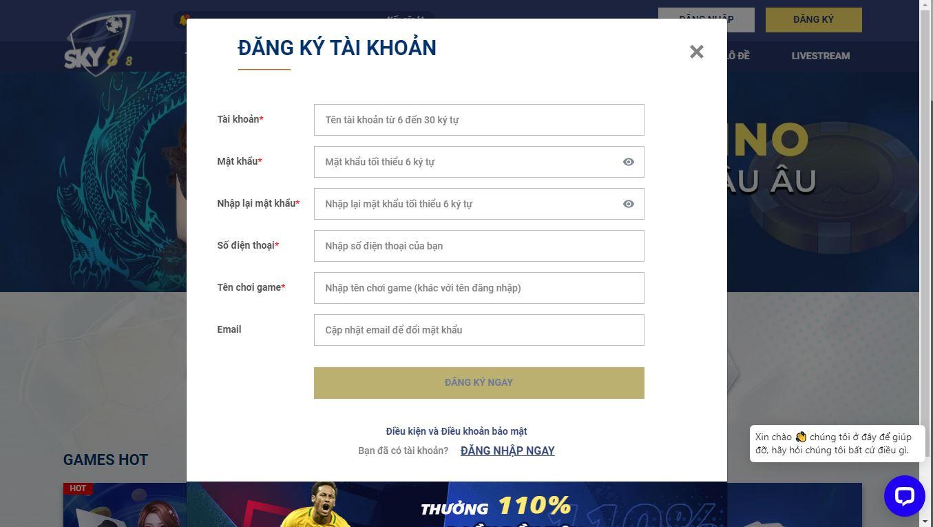 Bước 3: Kiểm tra thật chính xác thông tin cung cấp cho Sky88. Nhấn vào nút ĐĂNG KÝ NGAY để gửi thông tin về cho Sky88 tạo tài khoản mới.